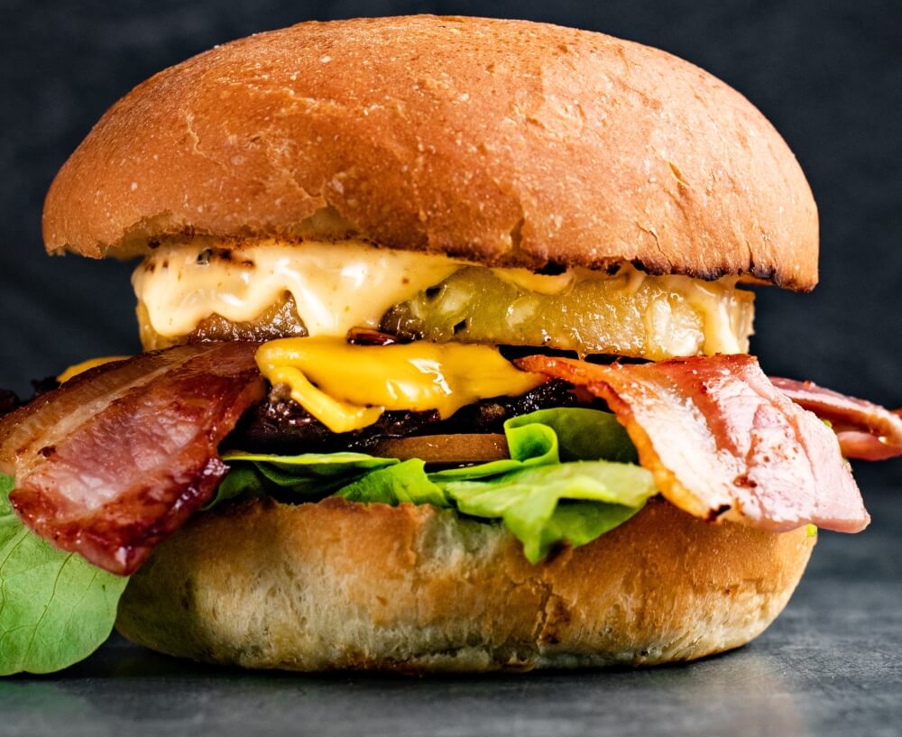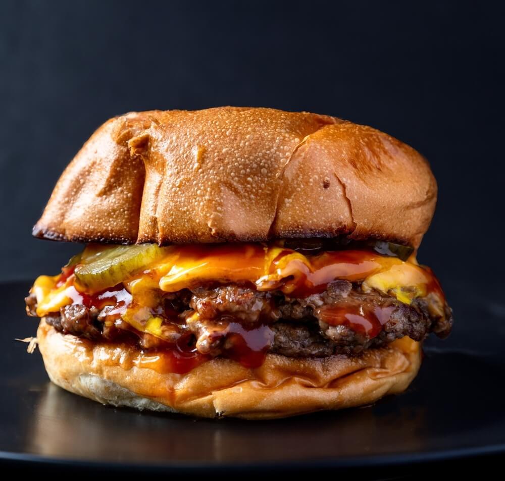2 beef patties, 2 slices of cheese, 2 x bacon, grilled onion, and choice of sauce.