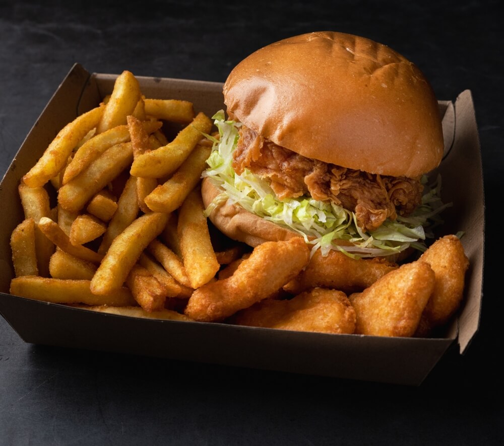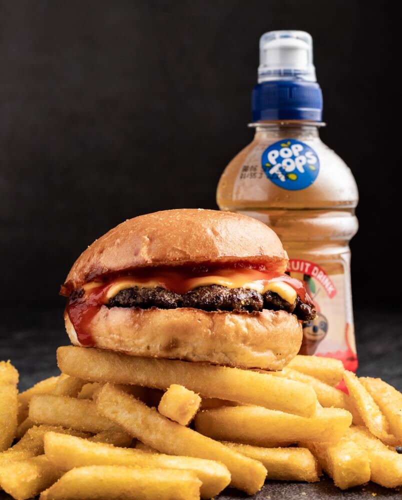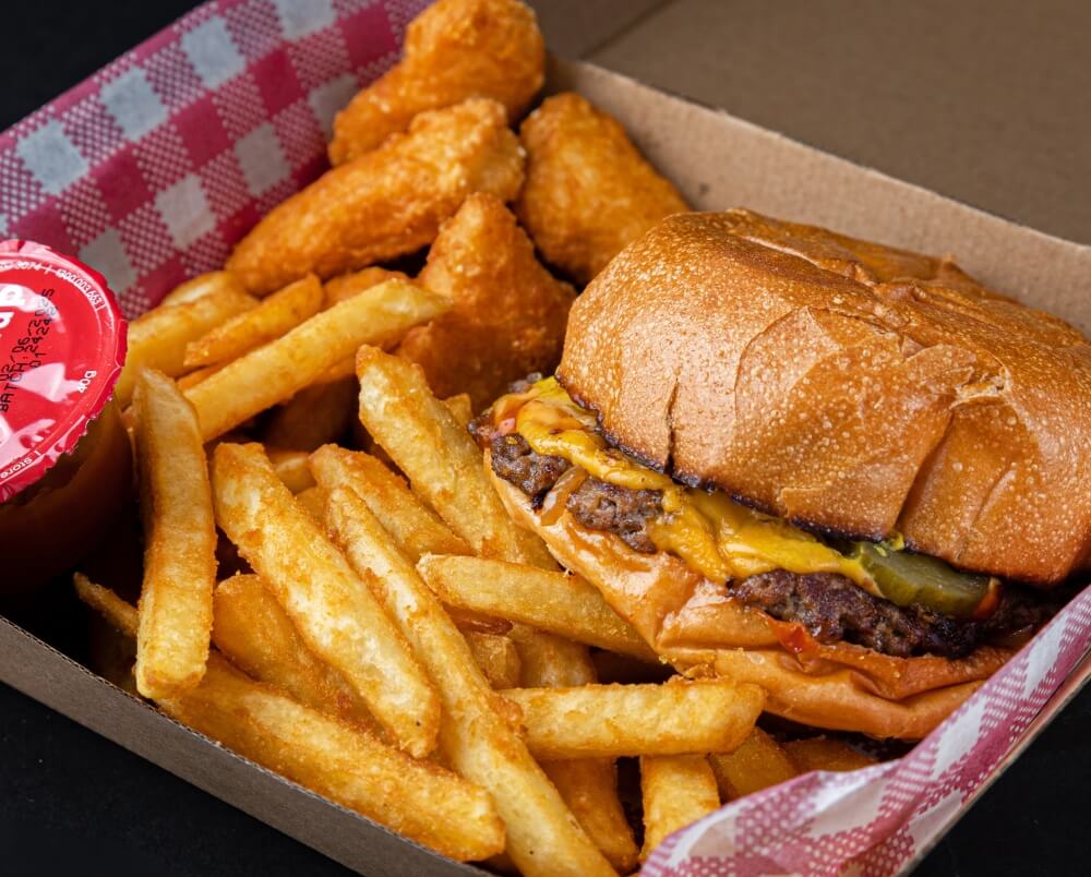 American Cheese burger, Extra small chips, 6 nuggets & dipping sauce.