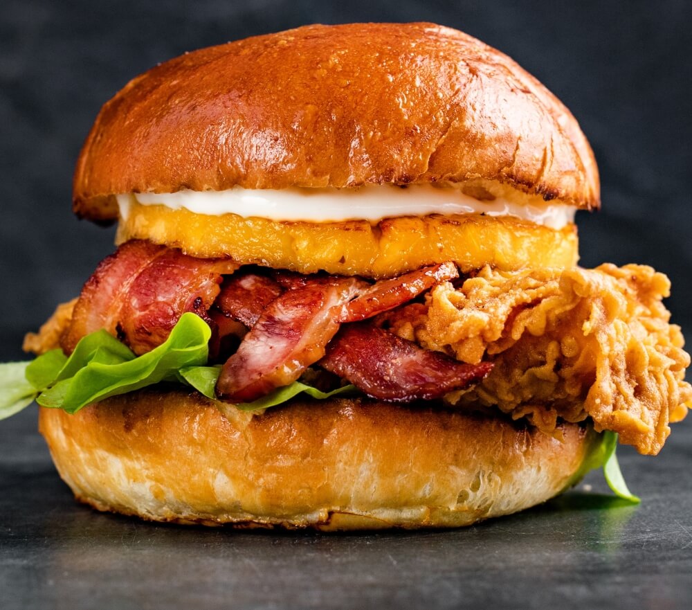 Lettuce, tomato, beetroot, beef patty, grilled onion, sliced cheese, bacon, pineapple, and choice of sauce.